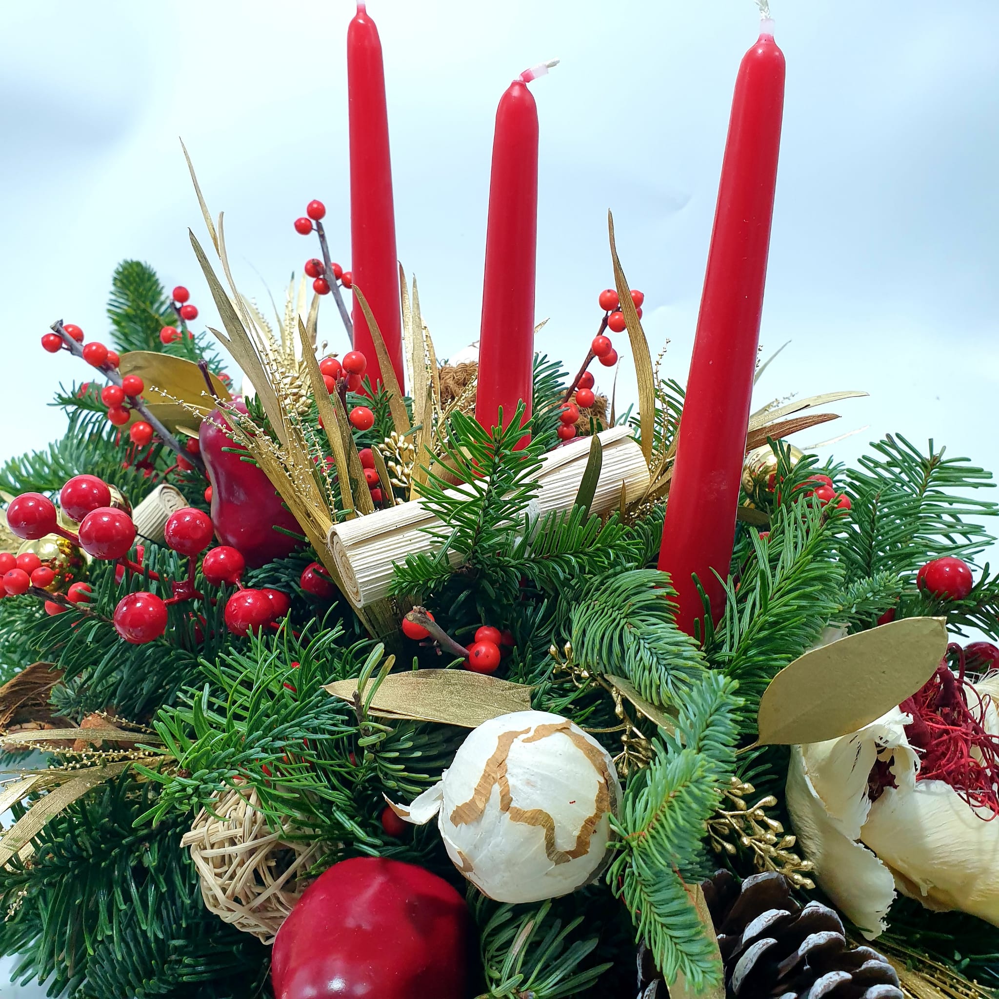 - Contrasti Cromatici: Il verde intenso del pino incontra il rosso vibrante delle bacche e delle mini mele, impreziosito da foglie e pigne rifinite in oro per un tocco di luce extra.