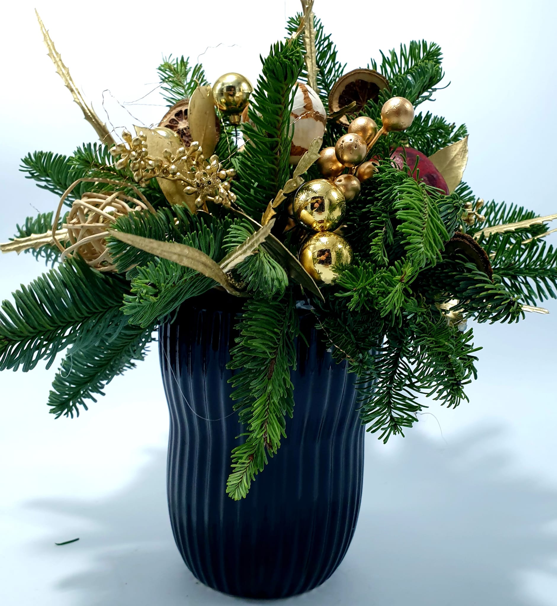 La composizione “Incanto del Bosco” è stata progettata per diventare un vero e proprio oggetto d’arredo. Il protagonista indiscusso è il vaso scanalato, la cui finitura scura e opaca crea un contrasto perfetto con il verde vibrante del pino e la luminosità degli elementi dorati. Questa texture moderna cattura la luce, rendendo la composizione dinamica ed elegante in ogni ambiente.