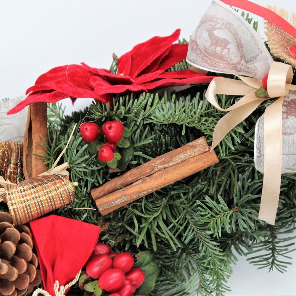 Ghirlanda Natalizia Rossa creata interamente a mano con prodotti naturali, rendendo questo articolo unico nel suo genere. La Ghirlanda è composta con rami intrecciati di abete normandiano naturali, fiori di stelle di natale rosse artificiali, pigne e bastoncini di cannella naturali, bacche natalizie artificiali, infine decorata con nastrini ornamentali di tessuto a tema ed originali fiocchi in tela di juta.